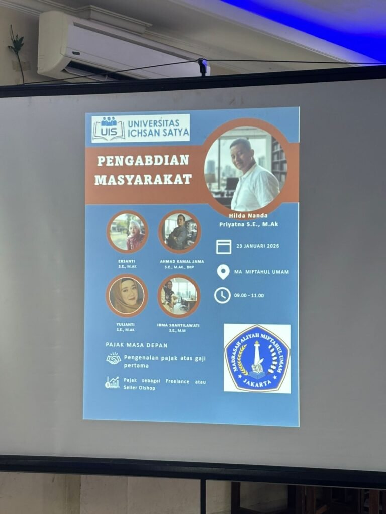 Madrasah Aliyah Miftahul Umam mendapatkan kegiatan penyuluhan bertajuk “Pajak Masa Depan: PPh dan Gaji Pertama” yang diselenggarakan oleh dosen Universitas Ichsan Satya (UIS) melalui program Pengabdian kepada Masyarakat, pada Jumat, 23 Januari 2026.